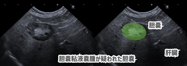 超音波検査では胆嚢内に不動性の貯留物が確認され、血液検査の結果と合わせて考え、胆嚢粘液嚢腫が強く疑われました。