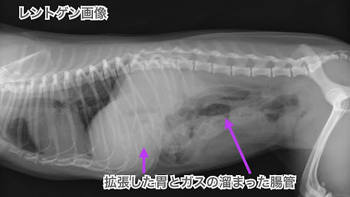レントゲン検査では、胃が大きく拡張して腸にガスが溜まっていました。